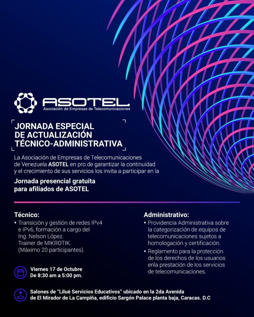 Estimados Agremiados, La Asociación de Empresas de Telecomunicaciones de Venezuela, tiene el agrado de invitarle a participar en la Jornada Especial Técnico-Administrativa, destinada a fortalecer capacidades, compartir buenas prácticas y promover la integración de las empresas de Telecomuniaciones. Los Esperamos